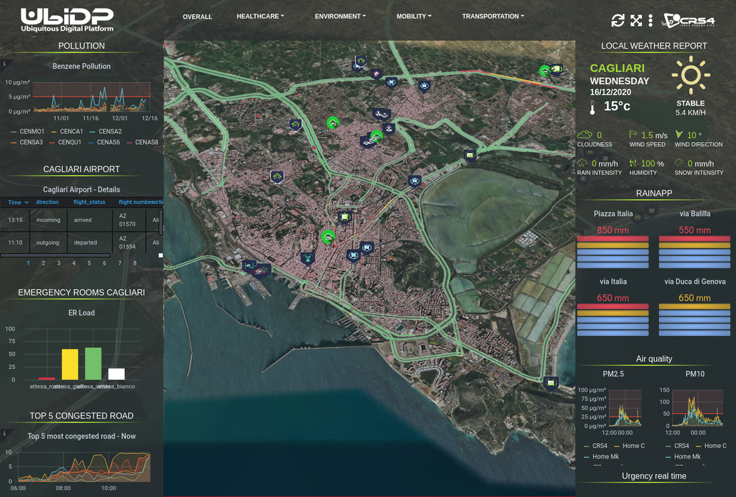 Si chiama Ubiquitous Digital Platform (UbiDP) il marchio depositato che identificherà la piattaforma operativa digitale del CRS4. UbiDP è in grado di gestire una significativa mole di dati di varia tipologia (immagini, suoni, video) che provengono da fonti diverse (governativi, di cittadini, da sensori, da internet, ecc.) e di trasformarli, grazie ad una serie di tecnologie software appositamente sviluppate e debitamente protette, in immagini e grafici per la gestione e il monitoraggio di eventi e situazioni anche critiche. La piattaforma sarà operativa per il coordinamento della logistica dei territori ed eventuali stati emergenziali, come alluvioni e incendi, e per la gestione del traffico, dei parcheggi, nonché il controllo del flusso delle persone durante grandi manifestazioni ed eventi. La piattaforma UbiDP può diventare uno strumento particolarmente utile anche nella gestione dei dati legati alla pandemia del Covid 19 nei diversi territori.