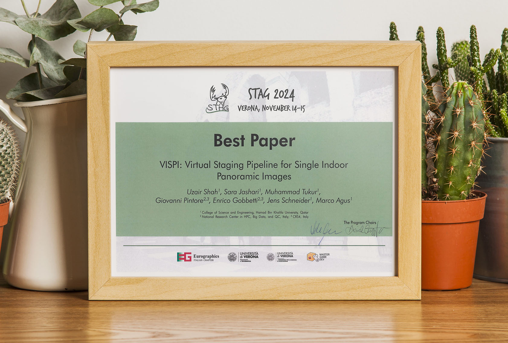 Enrico Gobbetti e Giovanni Pintore del settore Informatica Visuale e ad Alta Intensità di Dati del CRS4, in collaborazione con Uzair Shah, Sara Jashari, Muhammad Tukur, Jens Schneider e Marco Agus della Hamad Bin Khalifa University (HBKU) in Qatar, hanno ricevuto il premio per il miglior articolo alla conferenza internazionale STAG2024 (Smart Tools and Applications in Graphics, 2024), organizzata dall’Università di Verona e dall’Italian Chapter of the Eurographics Association.